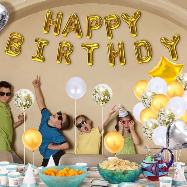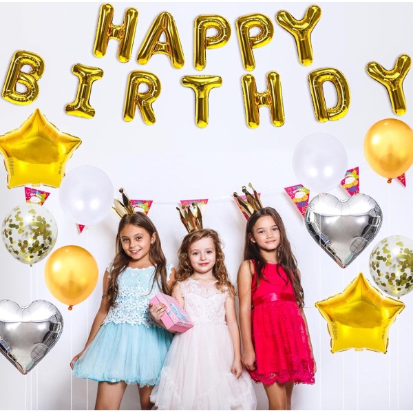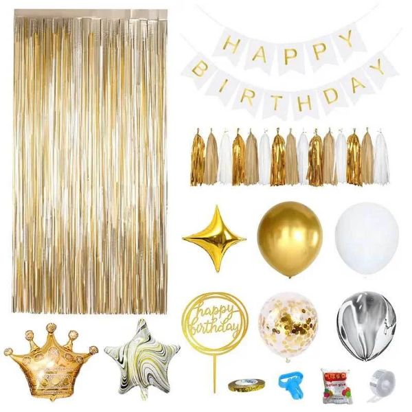 60 különböző színű lufi; 1x korona alakú lufi; 2x ötágú csillag alakú lufi; 2x négyágú csillag alakú lufi; 1x csillogó szalagokból készült függöny; 1x Boldog születésnapot felirat; 5x színes díszítő bojtokból álló készlet; 1x Boldog születésnapot tortadísz; Díszítő szalag, lufi kötöző kellékek, ragasztó és lufi rögzítő szalag.