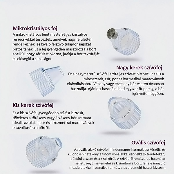 A készülék 4 cserélhető tartozékkal rendelkezik, amelyek mindegyike az adott bőrproblémák kezelésére szolgál. Az alábbi grafikonon részletesen megtudhatja, hogyan működnek az egyes tartozékok!