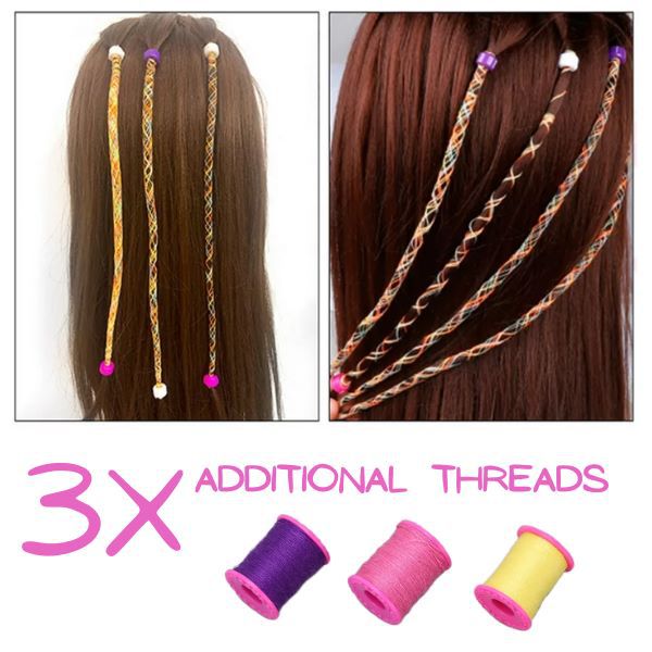• A csomag tartalma: 1x hajfonógép, 12x hajcsipesz, 3x cérna (sárga, rózsaszín és lila cérna), 2x fonal a könnyebb használatért.
